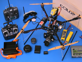 Double-axis video camera stabilization with a counterweight on an Ecilop drone.