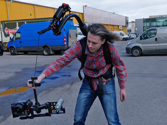• The inertial stabilization effect is amplified by a factor equal to the square of the distance from the center of rotation. Thus, the camera's stability with a counterbalance is several times greater than when placing the camera inside a gimbal. • The joint between the camera and the counterweight is more durable and lighter. The compact axial unit makes it possible to increase accuracy and reduce vibration. • The axial unit is located in the center of the design and ensures that the load is evenly distributed on the bearings. The frictional force in such an assembly is several times lower than if the axial unit were placed to the side of the load. • The servo mechanisms include torque sensors and ensure the accurate operation of the rotation mechanism. (Several other stabilizers use motors with torque control of the current consumption, but this provides less precise control) • There is no rigid connection between the gearbox and the platform in the used servo motors. Thus, the platform is protected against angular mechanical noises and backlash. • The servo mechanisms provide rapid stabilization even when you tilt the platform by 90 or more degrees. Thus, the capabilities of this stabilizer with just three axes are greater than other devices with six axles. (meaning stabilizers that are equipped with duplicate fast motors with a limited angle of rotation and additional slow motors). • The servo mechanisms used to control the actual magnitude of the force are lighter and more powerful than direct drive motors. (meaning brushless motors with a direct connection). • A mechanical gyrostabilizer or a battery or a transmitter or a monitor or another load could be used as a counterweight. Counterweight could be twice lighter compared to camera.