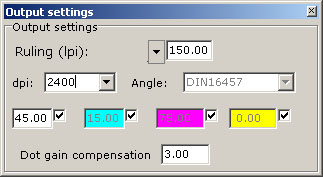 You may set another value, but it is necessary to take into account that at significant decrease of the difference between dpi and lpi, the quality of the image will be reduced, and the significant increase of the difference between dpi and lpi has no practical sense. For offset printing the recommended values of ruling are 90-150 lpi (taking into account that in separate places of the image ruling will become higher). The disproportionate value of ruling for perpendicular directions may also be defined.