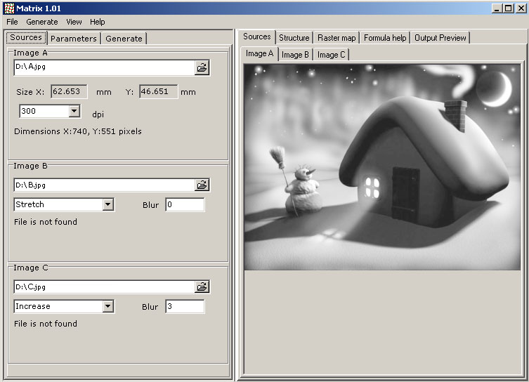 The field "Blur" defines the smoothness of transition from one kind of a raster to another in a final composition. At screening color images sharp transitions from one kind of a raster to another are undesirable. The size of blurring is marked in pixels.