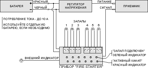Для подключения запалов используйте провода площадью сечения 0,2…0,5 мм? (0,5…0,8 мм диаметр). Не используйте тонкие провода, если запалу требуется более 3А тока или если длина провода более 1 метра. Для подключения к батарее используйте короткие провода площадью сечения 0,5…1 мм? (примерно 1 мм диаметр).