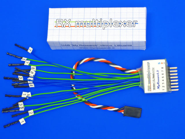 RX Multiplexer ensures reliable control of a model in two communication channels. It is usable in long-distance flights or in case of control from two different points. The device enables a manual or automatic switching of control between two on-board receivers. Using two different bands of communications ensures reliable control of a model both in the limits of direct visibility and in case of existence of obstacles. The number of commutated channels is 8 plus one channel for controlling the device.
