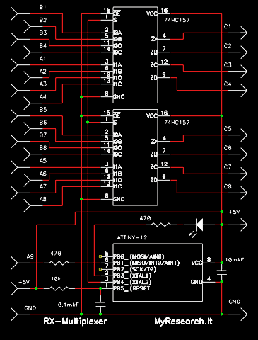 The device is equipped with eight inputs for signals from the first receiver (green wires) and eight inputs for signals from the second receiver (blue wires). Servomechanisms are connected to eight outputs of the device. It is not required to use all inputs and outputs. One channel of the first receiver is used for controlling the device. If the value of the control signal is 100% (the duration of the control pulse is 1.7-2.1 ms), controlling through the first receiver takes place. If the value of the signal is another, controlling through the second receiver takes place. Flashing LED indicated activation of the first receiver. Do not forget to programme the inverse value of signal for "Fail safe" mode.