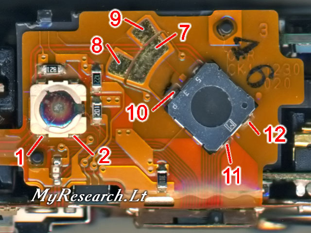 If the resistance between the contacts is less than 100 Ohms, it means that they are closed. If the resistance between the contacts and the metal screen of the scheme (3) exceeds 500 kOhms, it means that this contact is not being used. As regards this particular example, the second (4) and third (5) outlets of the switch are closed in the regime "video", whereas the third (5) outlet is not being used. The second (4) and fourth (6) contacts are closed in the regime "photo". It means that the switch must be left in the position "video", whereas the outlets of the device RC Shutter must be connected to the second (4) and fourth (6) contacts. The contacts, which are being closed with the help of the transfocator's lever, are well seen (7, 8, 9). It is desirable to connect the RC Shutter so that the wires do not derange this lever's operation. The button of focusing and shutter has two positions. It must be ascertained with the help of the tester, which contacts are closed after having pressed them slightly (10-11) and which contacts are closed after having pressed them more strongly (10-12). The RC Shutter is connected in parallel to these pairs of contacts.