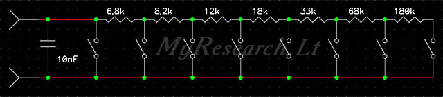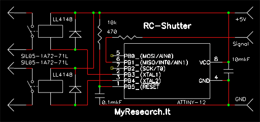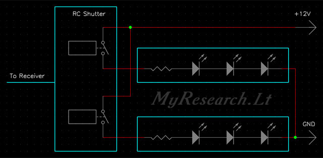 The number of buttons and resistance rates may differ. The device RC Shutter is connected instead of the buttons. If no remote control panel is available for the photo-camera, the outlets of the device are connected in parallels to any buttons inside the camera. The device RC Shutter allows controlling two functions via one control channel. The scheme, showing operation of the device, is submitted below. As regards this scheme, the device is used for controlling the board lights of the model.