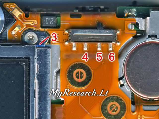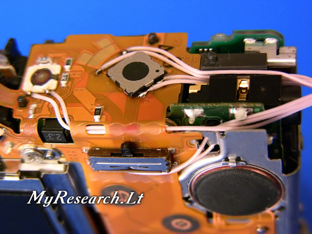 It is convenient to use thin wires and a small soldering iron, aiming at connecting to the contacts. It is sufficient to connect the outlets of the device RC Shutter to the contacts of the button. The same method is used for connecting the contacts to the button, assigned for switching the camera on (1, 2).