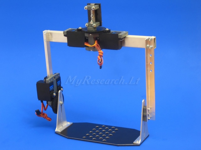 In case of the vertical installation with fastening from below or from above, it allows obtaining of the circular panorama and regulation of the tilt of the camera. In case of horizontal fastening, the gimbal allows achievement of active stabilization of the camera along the axles of the longitudinal tilt and lateral lurch. Additional electronic gyroscope is needed for active stabilization. 360 deg. rotation is possible for both axes. The control signal predetermines the rotational speed of camera independently on its position (upon the neutral signal, the camera remains immovable). The patented double servo-drive, assigned for soft rotation of the camera, is used. It will provide a more clear view. Buying the gimbal without servos you can install two or four digital servos Turnigy MG930. You can use the servomechanisms with the required modification: cyclic rotation / 180 degrees / double servo / usual servo.