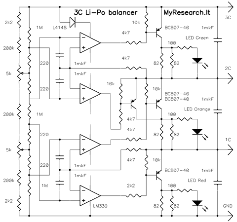 Analog balancer for lithium batteries (Li-Po, Li-ion, Li-Fe)
