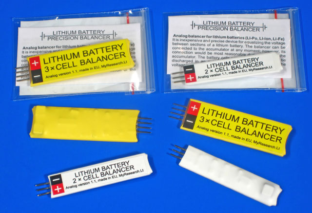 It is inexpensive and precise device for equalizing the voltage between sections of a lithium battery. Versions for balancing two-section and three-section batteries are available. The balancer can be connected to the accumulator at any moment; however, its connection would be most reasonable during charging the accumulator. The battery cells with a higher voltage will be discharged in an automatic way until equalization of the voltage is achieved.