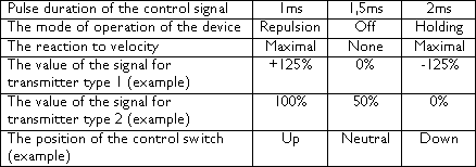 The device is mounted on the body of the model with the sensor directed downwards. On models of planes and gliders, the mark "Front" should be oriented forwards. No elements of the construction should block the sensor. On uprising and landing, no sand and moister should get into the sensor. Before flying, the device should be adjusted. Connect the device according to the chosen scheme (see the previous sub-section). Prior to adjusting the device, the trimmer on the control panel and any other limiters of the control channel shall be switched off to ensure a deflection of the servo to the maximum value possible while flying. On switching-on the on-board power supply, hold the button on the device pressed (the button is pressed through the elastic film in the specified point). After release of the button, the LED of the device will flash with a long interval. On the control panel, set the control stick of the chosen channel to the position that corresponds to the maximum descent and press the button once more. Now the LED shall flash twice in turn. Set the control stick of the chosen channel on the panel to the position that corresponds to the maximum increase of the altitude and press the button once more. Now the LED shall flash frequently. Then the degree of response of the device to the parameter of altitude in the repulsion mode should be set. The position of the control stick that corresponds to descent means an absence of any response to the altitude, and the position of the control stick that corresponds to uprising means the maximum deflection of the servo proportional to decrease of the altitude. For probative flying, set the stick to the neutral position and press the button once more. Now the device is activated and operates in the mode set by the additional control channel. The neutral signal of the channel for mode controlling means an absence of any response. A change of the signal towards its reduction activates the repulsion mode with the response to the altitude that conforms to the preset value; the response to the vertical velocity will be proportional to the deflection of the signal of the additional channel from the neutral position. The value of the additional channel's signal is finally adjusted on probative flies. The goal of adjustment is ensuring a stable flying of the model in the required mode. The response of the device to approaching should be sufficient and its waving-like vibrations should be the minimum. The data on conformity of the mode of operation to the signal of the control channel are provided in the table below.