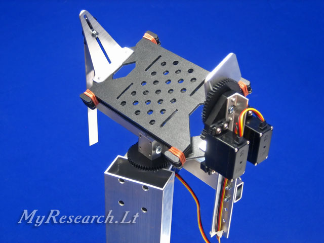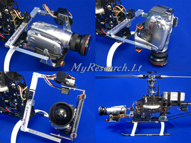 The servo-mechanisms, modified for turning for 360 degrees, are used in the camera gimbal. The both servo-mechanisms are connected to one control channel. In case of the neutral control signal, the conjugated servo must rotate slowly to the opposite sides. An electronic synchronizer may be applied for synchronizing of the servo-mechanisms. Such devices are being produced by several companies, but it is possible to manage without it. The speed of the servo without the load is fixed by the potentiometer, which is disconnected from the gears. The preliminary tuning may be done as follows: fix the control signal at -2 % from the neutral position and achieve halt of the first servo; fix the control signal at +2% from the neutral position and achieve halt of the second servo. If You have such possibility, it is desirable to measure the current, which is consumed by the servo in case of stoppage of the motor by force, while tuning. Start tuning from the low current, for example, from 20 mA. The assembled servo-mechanism without the load rotates very slowly at such current. If the heavy camera is fixed on the gimbal and its center of gravity does not coincide with the rotation axle, it will be necessary to increase the load upon the servo-mechanism artificially, seeking for stabilization. The excessive load will cause breakage of the servo-mechanism. Thus, pay more attention to the balanced condition of the whole mechanism; it must not swing as the pendulum.