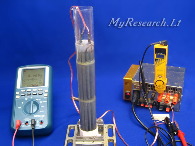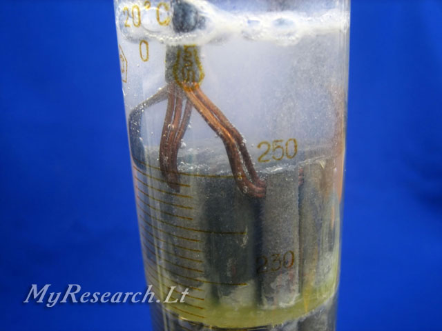 The temperature of water raised by 6 degrees within 10 minutes of operation, whereas small gas bubbles appeared at the electrodes. As the current increases, so producing of gas increases considerably, up to strong seething; however, the water heats quickly and starts to evaporate.