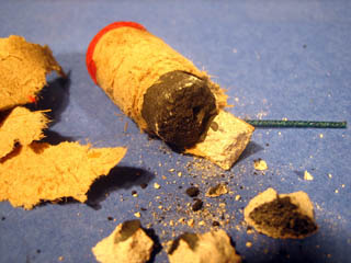 5) Get the black smoke gunpowder out of the petard. An ordinary petard: it's the powder in the paper packing, plus the slow-match. The black gunpowder in rockets is compressed, but is easily crumbled. The cement or the clay, out of which the nozzle is made in the rocket, or the caps in the petard should be thrown away. The fine powder of the black gunpowder is necessary. The black gunpowder is resistant towards hits and rubbing, however, it easily blazes up from the open fire. Don't keep more than several grams of the gunfire in Your place of work. The black gunpowder is substituted with other compositions in certain pyrotechnics.