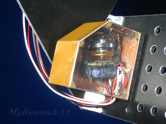 Such a servomechanism is usable for controlling the bank of the aircraft or the inclination of the camera. You'll be able to control the inclination of the camera; the neutral position will conform to the horizon line. In addition, it is possible to control the ailerons of the aircraft and to incline the aircraft to the desired angle in respect of the horizon. If the horizon line is not symmetric, a bank of the aircraft appears. The scheme of the sensor: