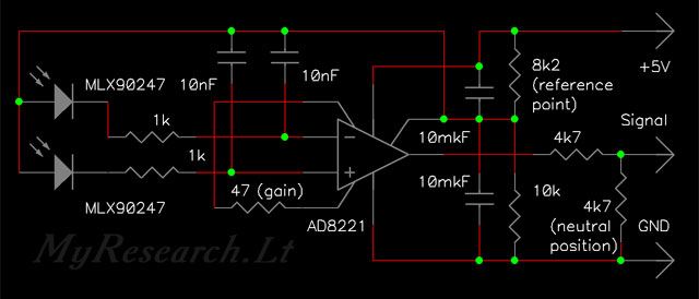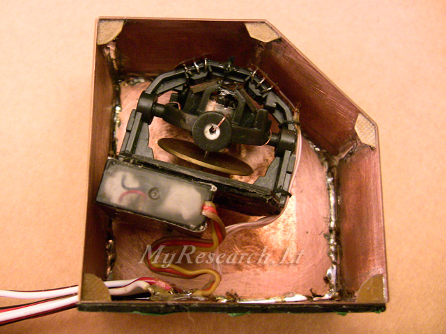 IR photocells are fixed on the movable part of the controlled gimbal of the camera or on the opposite ends of the controlled model. A signal of the sensor is applied to an ordinary servomechanism instead of the internal potentiometer. The potentiometer of the servomechanism is connected to the negative terminal, to the reference voltage and has one output (3 conductors); the infrared sensor is connected in the same way.