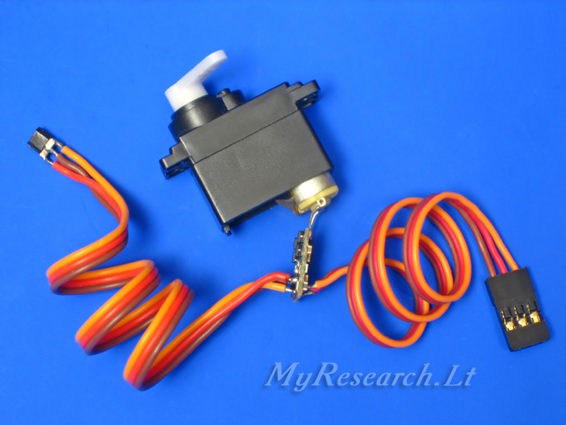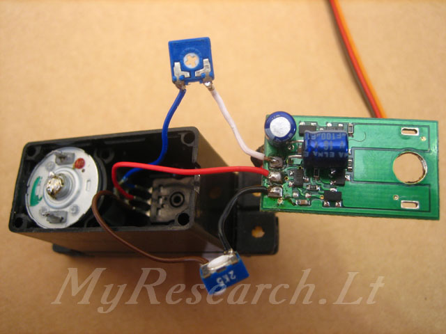 The view reflects the standard servo-mechanism out of the set of the equipment SPECTRUM. Resistance of the potentiometer is 5 kOhms; two extra potentiometers (2,5 kOhms each) are installed; the maximal deviation makes approximately 200 degrees (+-100).