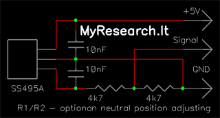 Such a servomechanism is usable for controlling various mechanizations, such as gear extension or rotation of any element via a supplemental reducer. I used such sensors for leveling-off the video camera in respect of the position of the mechanical gyroscope. A Hall sensor ensures a proportional response to a change of the magnetic field, taking into account the polarity. An absence of magnetic field or the neutral magnetic field (in case of equal distances from the opposite poles) in the transformed servomechanism conforms to the neutral position of the potentiometer in an ordinary servomechanism. The sensor responds to a shift or rotation of the magnet; it is also possible to use two magnets in two extreme positions. The scheme of connection: