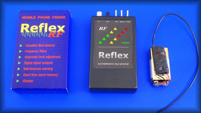 While staying in the on-duty regime, the device reflects the weakest alterations of the level of the electromagnetic field; besides, the LED indicator functions in the regime of the cursorial dot. When the level of the electromagnetic field exceeds the maximal value of the indicator, staying in the on-duty regime, the attenuator switches on automatically; besides, the light-emitting indicator turns to the regime of indication in the shape of the increasing column and the user is notified either by the sound signal or by the vibroringer. The user is provided with the possibility to alter sensitiveness of the detector, to select the way of notification and switching off the function of reacting towards the weak signals of the remote mobile phones of the GSM standard. The internal antenna is used for detecting the mobile telephones, whereas the external antenna may be switched off. The communication devices, attributed to the standard GSM 900 and 1800 MHz, can be detected while realizing the communication and at the moments of switching the service on; the memory indicator continues to illuminate within 60 sec. after making play. Remoteness of detection depends upon the radiation power and conditions of screening of the transmitter by the outside objects. Powerful stationary transmitters can be detected at the distance, exceeding 20 meters. The collateral radiations of the domestic electric appliances can be detected at small distances. If compared with the system of neutralization of the means of communication, no permits for application of the searching device Reflex RF are need.